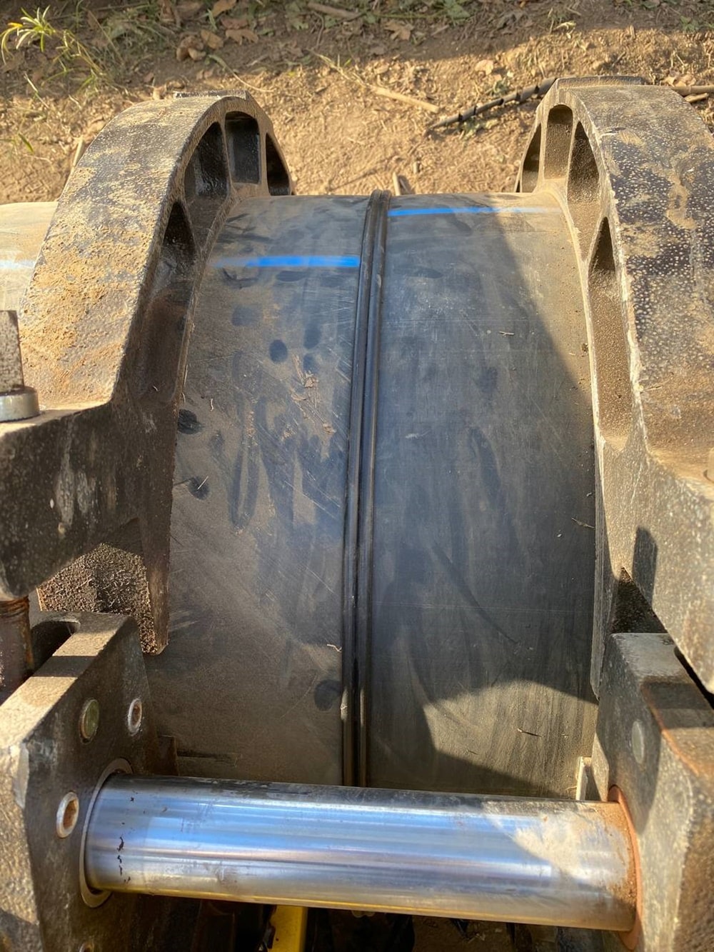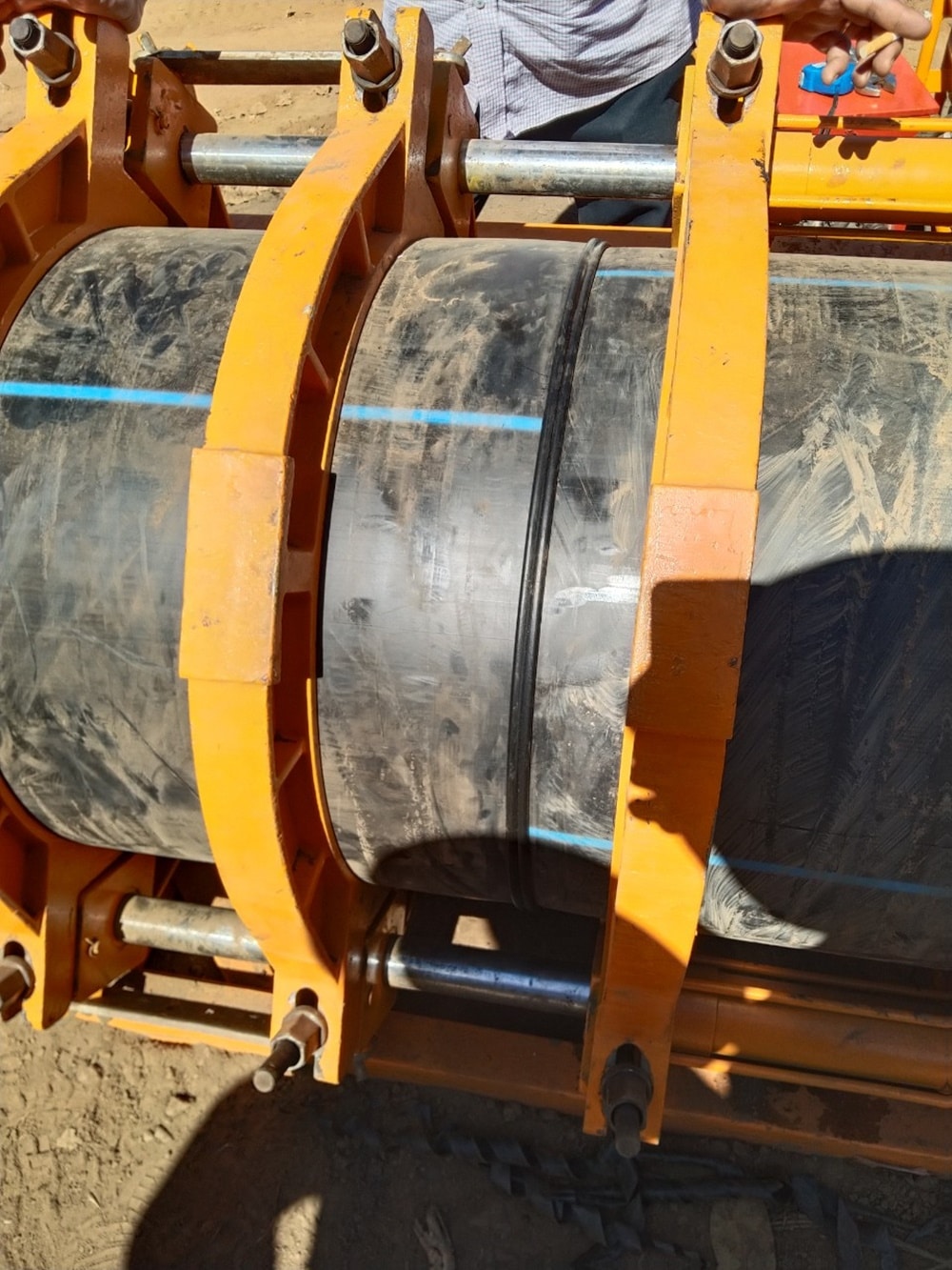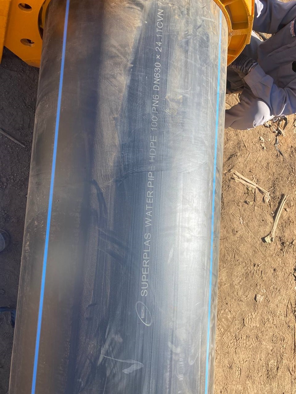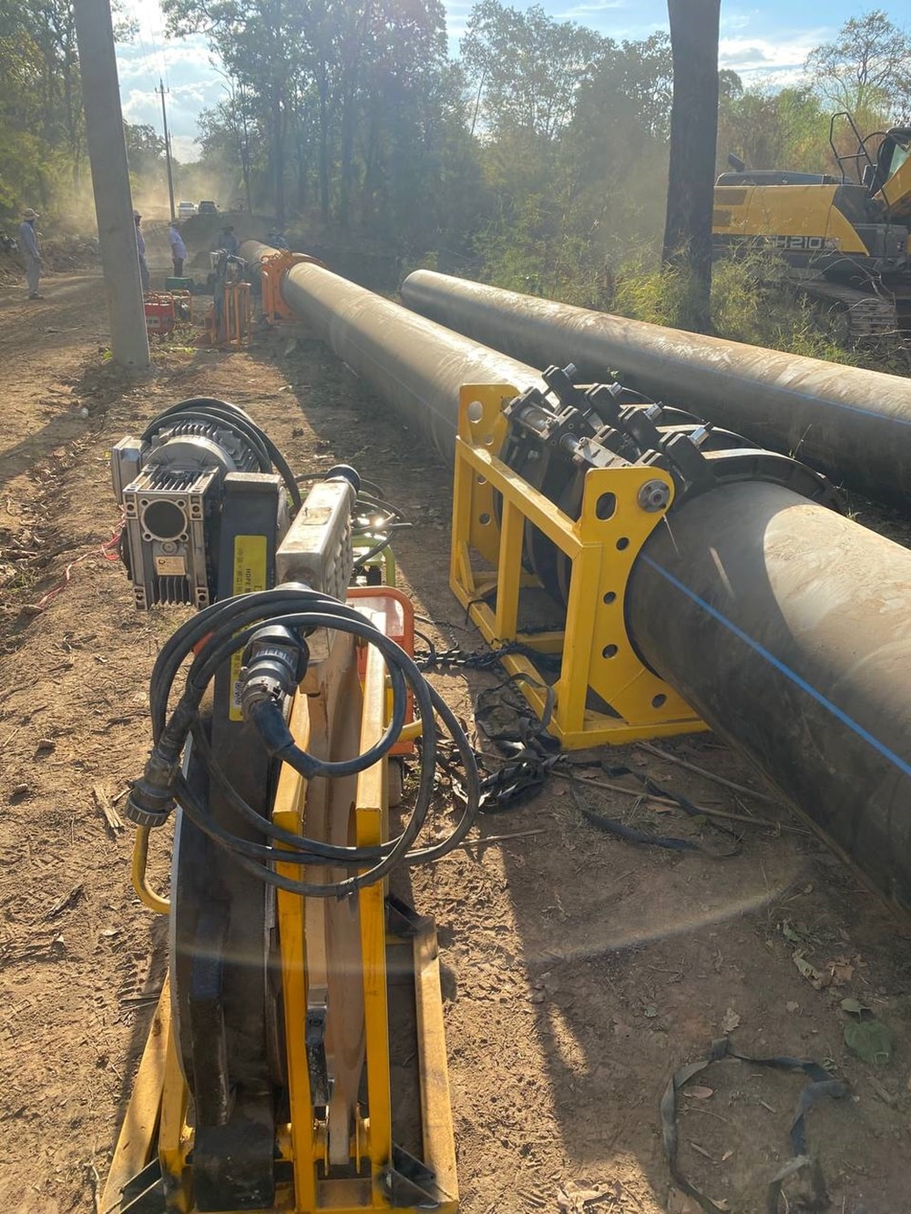 Ống HDPE được đặt vào rãnh một cách cẩn thận. Để tránh hư hỏng, công nhân không kéo lê ống trên nền đất gồ ghề. Ống được căn chỉnh đúng vị trí, sẵn sàng cho bước hàn nối.